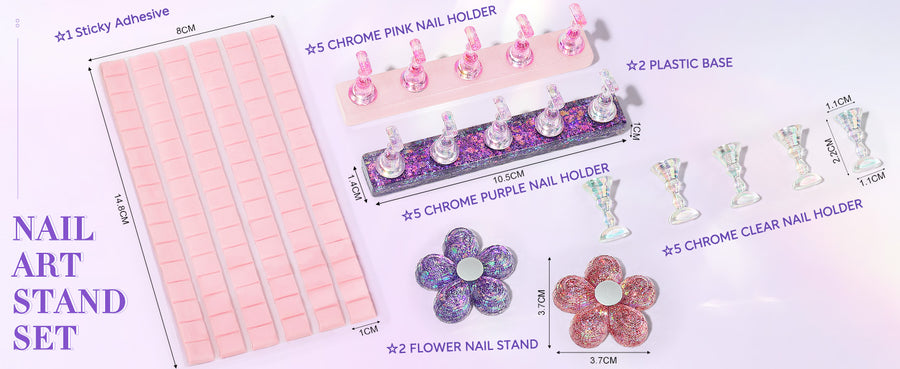 • Complete Nail Practice Stand Set: Includes 15 nail stands, 2 pink flower-shaped bases, 2 clear bases, and 96 reusable adhesive putty for endless nail art designs. Securely attach press-on nails & tips for mess-free painting, design, and precise lamp curing. Draw stress-free!