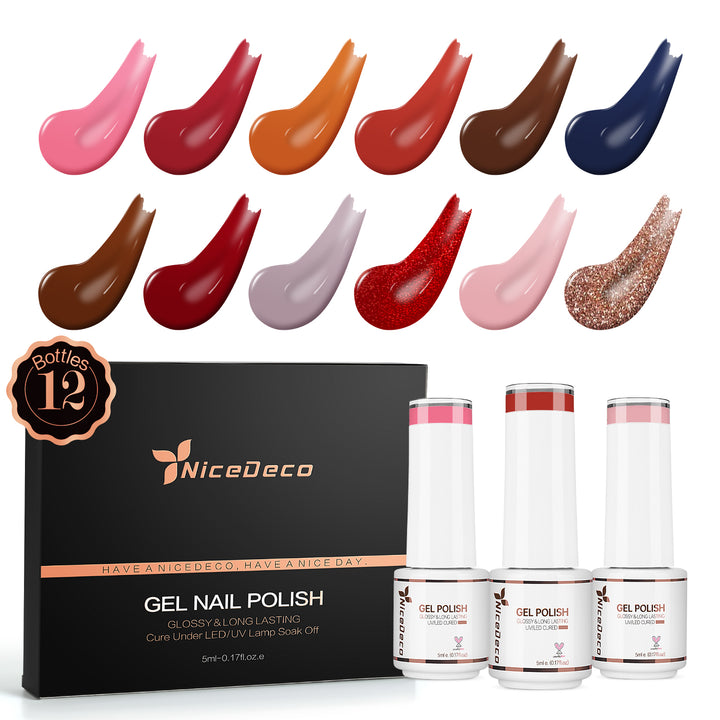 Nicedeco Gel Nail Polish Nail 12 Colors, Hema Free, Cruelty Free, Vegan, Nude Pink Orange Brown Fall U V Gel Manicure Kit 7