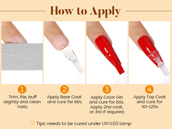 - Quick and Easy Application: : Get salon-grade nails in half the time with Nicedeco quick and easy application process. Simply brush on, and cure for 1-2 minutes with LED U V nail lamp.