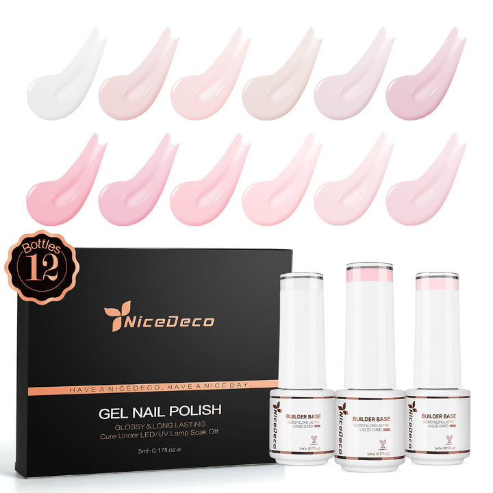 Nicedeco Builder Nail Gel Polish 12pcs, Hema Free, Cruelty Free, Vegan, Base Colors Nude Pink Hard Strengthener Rubber Gel Extension Kit 1